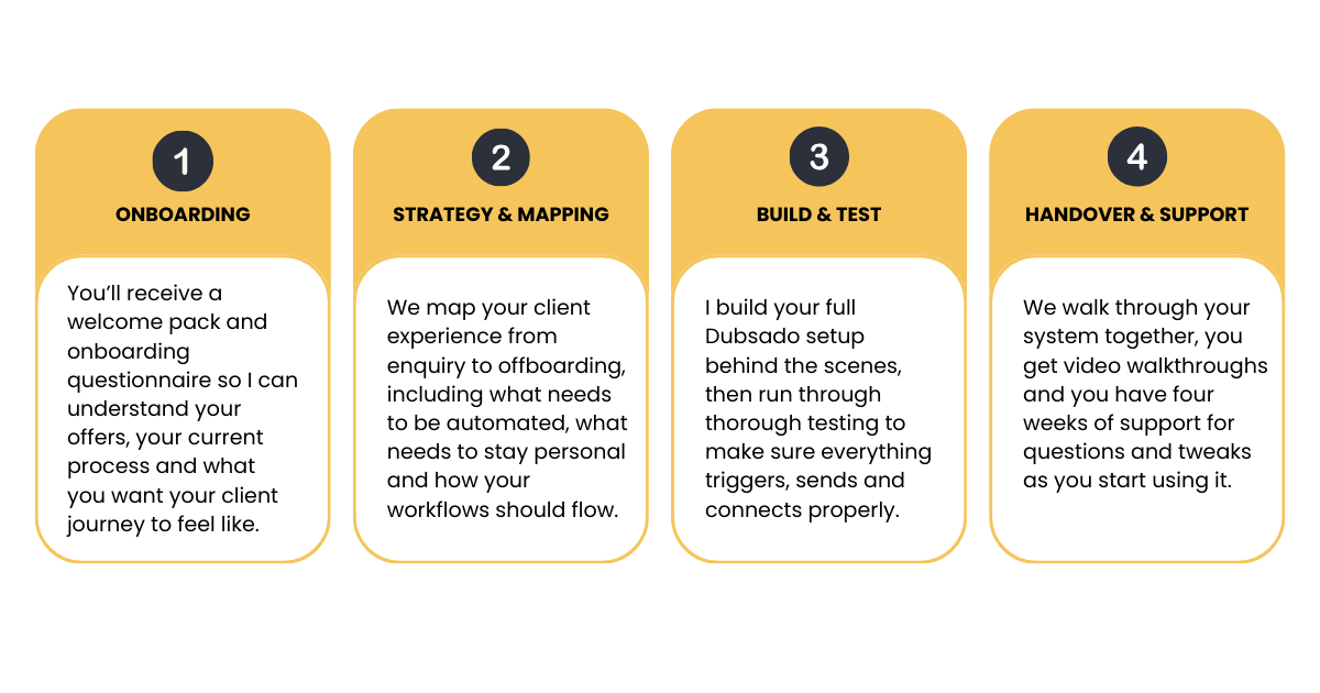 A done-for-you Dubsado build that elevates your client experience, reduces manual admin and gives you a backend you can trust.