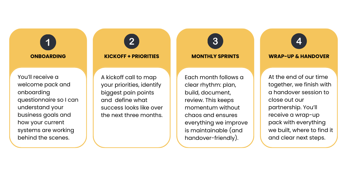 You get 20 hours per month of strategy-led implementation to build, refine and optimise your backend systems. Automations, documentation, platform tidy-ups and campaign support focused on reducing admin long-term.
