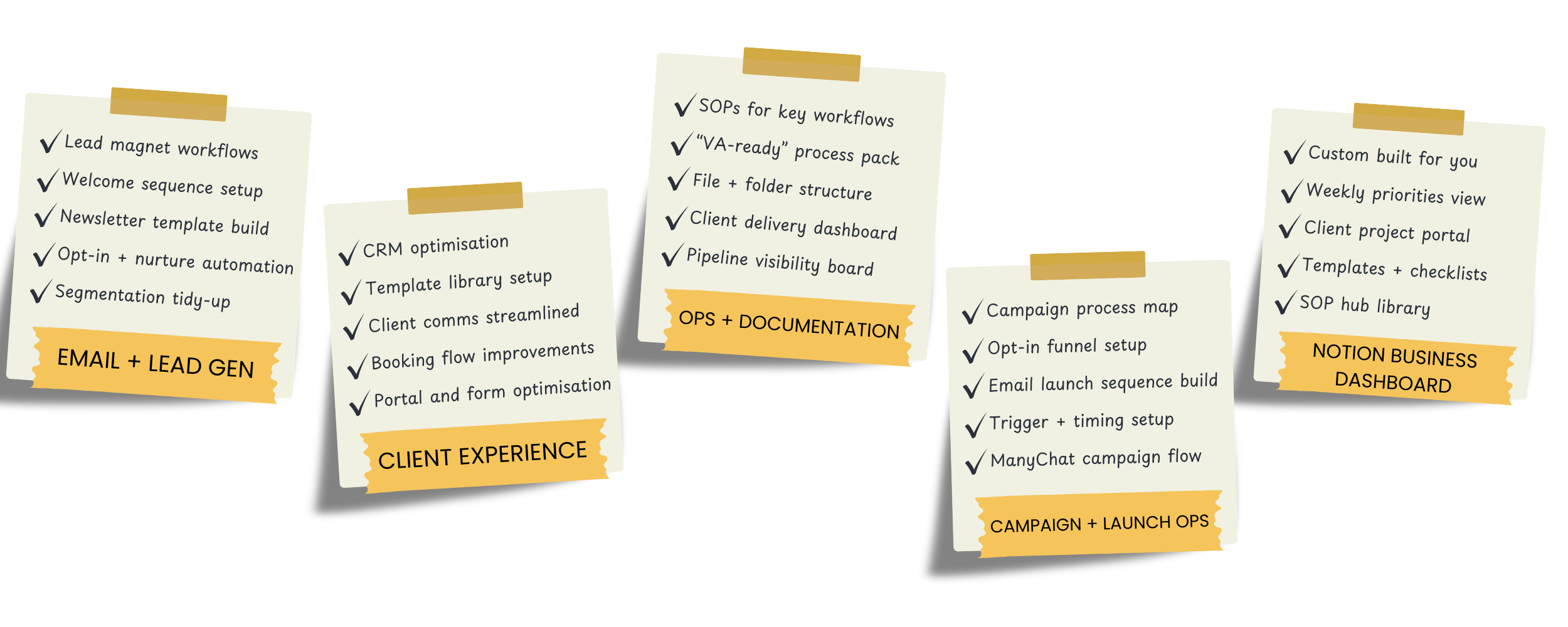This is for you if you need someone to build the systems behind the tasks, so your business runs smoother, feels calmer and is actually handover-ready when you hire support.